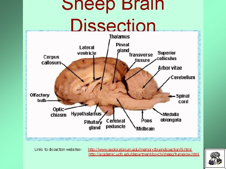 Sheep Brain Neuroanatomy Online Self-Test. Use each diagram as a reference, and selected the correct answer for each lettered structure. You may find it useful to open the diagrams in a separate window to review while answering each question. Dorsal Surface. Sheep Brain Anatomy Lab Manual. Based on original material by R. N. Leaton, Dartmouth College. Contributors to this version: Al Sorenson, Lisa Raskin, Sarah Turgeon, Steve George, and JP Baird. I. Introduction. The brain of the sheep is useful for study because its anatomy is similar to human brain anatomy. Although exact proportions (and names. Use the online sheep brain guide to help you find structures. There is a link to this site on the syllabus and list of class related sites. It should be up in the lab when you come in. For the most part, except for 1, the numbers refer to the images on the online sheep brain guide. Play this game to review Human Anatomy. Name this part of the brain. Preview this quiz on Quizizz. Name this part of the brain. Sheep Brain Dissection DRAFT. 6th - 12th grade. 193 times. Biology, Other Sciences. 77% average accuracy. a year ago. mrsturmscience. 0. Save. Edit. Edit. Sheep Brain Dissection DRAFT. a year ago. by mrsturmscience.