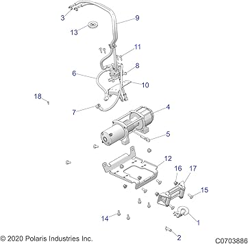 1 1 Winch-POLARIS, 4.5 2204629 2 1 Hook-Latch, Winch 2411836 3 1 Roller-Fairlead, Winch 4500 2411847 4 1 Cable Winch Steel, 7/32" 2878889 5 1 Contactor Winch 4015095 6 1 Remote Winch Switch 4013466 7 1 Power Cable, Winch Black 6 GA 4013470-250 8 1 Power Cable, Winch Red 6 GA 4013471-250 9 1 Remote Socket, Winch Long 4014228 10 1 Winch Mount.