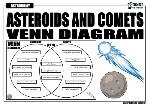 Product Description. This is a great visual and hands on activity to get students researching the differences between asteroids and comets. Simply cut out the labels and glue them onto the comparison Venn diagram.
