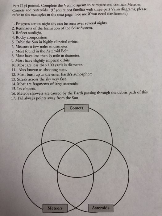 Description. Use this resource to organize ideas about meteors, asteroids, and comets. After learning about these celestial bodies, students can record their ideas in the Venn Diagram (a 3-circle Venn Diagram so students are also able to show when two of the celestial bodies have something in common). The second page has facts that students can.