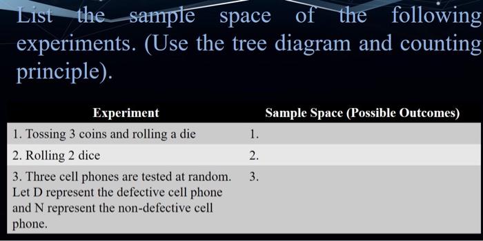 Tree diagram; In probability theory, the sample space (also called sample description space or possibility space) of an experiment or random trial is the set of.
