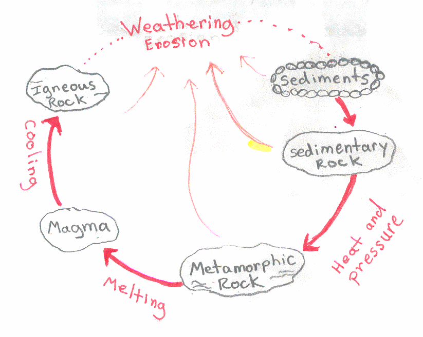 Rock. A mixture of minerals, volcanic glass, organic matter, or other materials. Rock Cycle. A series of processes on the surface and inside Earth that slowly changes rocks from one kind to another. Igneous Rock. Rocks that form when molten rock or magma, cools and hardens. Lava. a copy of the Rock Cycle Printout and Rock Cycle Station. Students will roll the dice, and according to the Rock Cycle Station sheet, they will undergo a change (pressure, heat, hurricane, volcanic eruption) and will move or stay depending on how their type of rock would respond. For example, if one student Use the rock cycle chart to answer the following questions. 1. What process(es) are needed for igneous rock to become sediment? 2. What process(es) are needed for sediment to become sedimentary rock? 3. What process(es) are needed for sedimentary rock to become metamorphic? 4. What process(es) are needed for metamorphic rock to become.