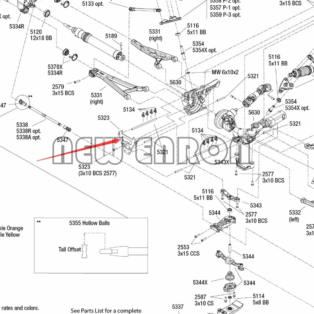 Traxxas Jato 3.3 (5507) Front Assembly Exploded View. 5595: Turnbuckle, aluminum (red-anodized), front toe link, 61mm (1) (assembled with rod ends and hollow balls) (see part 5539X for complete set of Jato aluminum turnbuckles)