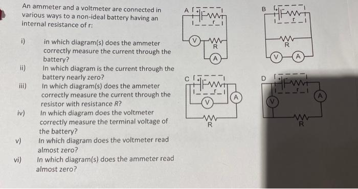 Physics questions and answers. 1) in which diagram (s) does the ammeter correctly measure the current through the battery ? 2) In which diagram is the current through the battery nearly zero? 3) In which diagram (s) does the ammeter correctly measure the current through the resistor with resistance "R" ? 4) In which diagram does the voltmeter.