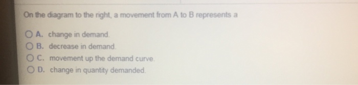On the diagram to the right, a movement from A to B represents a A. decreases in demand. B. change in demand. C. movement up the demand curve. D. change in quantity demanded. Answer. According to the law of demand there is an inverse relationship between price and quantity demand. The change in demand is caused by any factors other than its own.
