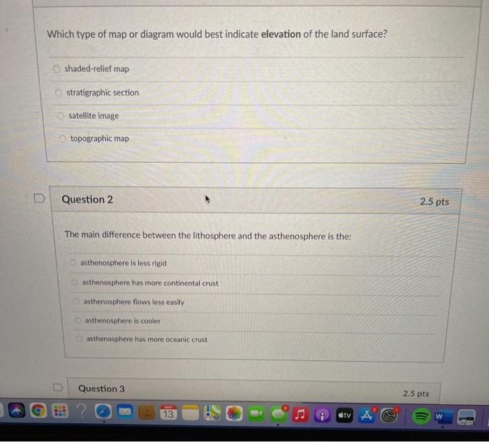 Transcribed image text: Which type of map or diagram would best indicate elevation of the land surface? shaded-relief map stratigraphic section satellite image topographic map Question 2 2.5 pts The main difference between the lithosphere and the asthenosphere is the: asthenosphere is less rigid asthenosphere has more continental crust asthenosphere flows less easily asthenosphere is cooler.
