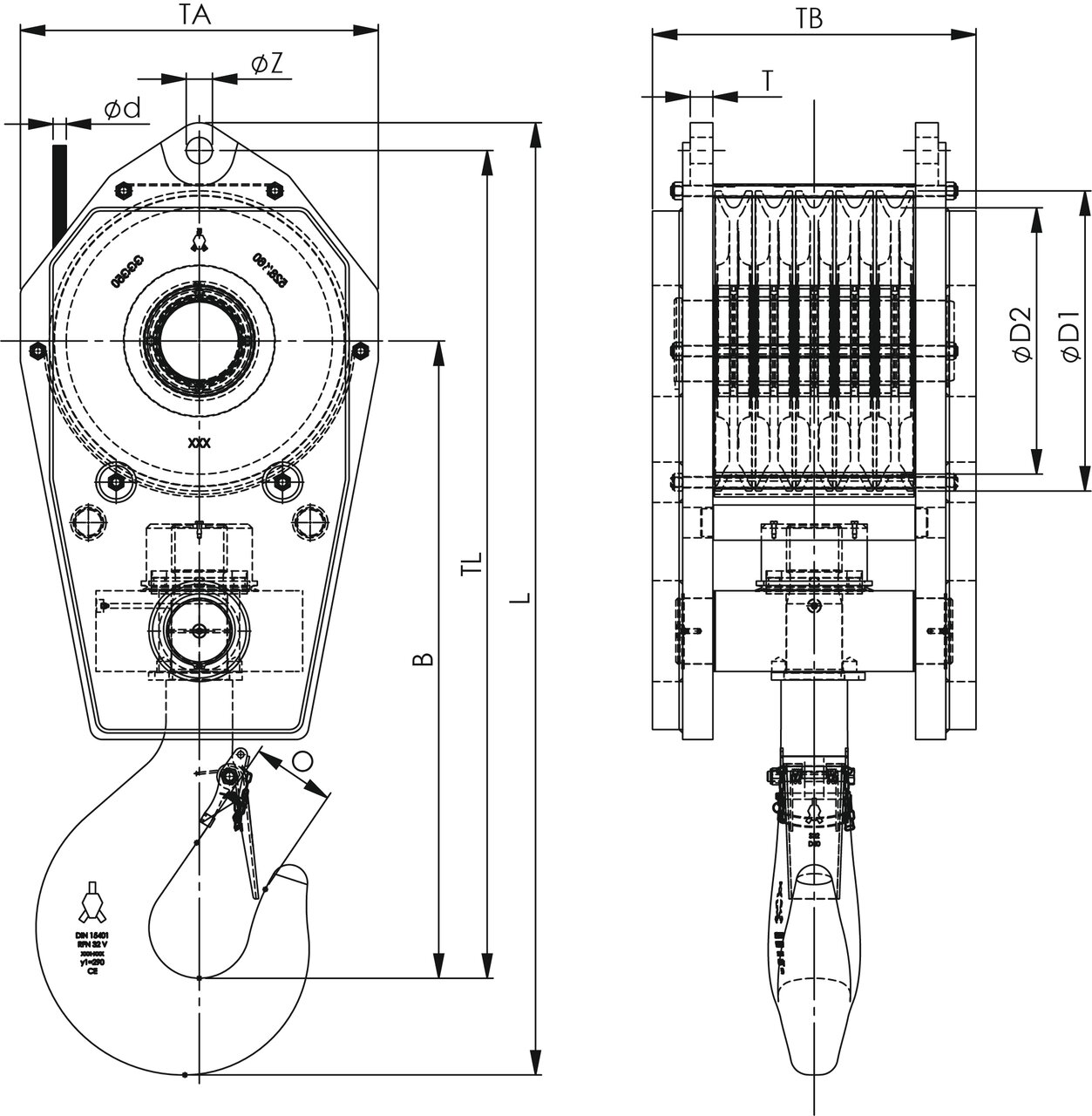 35 t hook block, 700 kg with one 500 mm Nominal O.D. roller bearing sheaves. (40 USt hook block, 1,881 lb with one 24" Nominal O.D. roller bearing sheaves.) 70 t hook block, 900 kg, with three 500 mm Nominal O.D. roller bearing sheaves. (90 USt hook block, 4,060 lb, with three 24" Nominal O.D. roller bearing sheaves.)