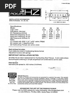 Emg Hz Wiring Diagram. EMG-HZ Pickups, so any EMG-HZ Passive Pickup can be installed with any other EMG-HZ Included in this data sheet are the most common wiring diagrams. All EMG-HZ bass pickups feature bar style construction. EMG-HZ Diagram 6 The legend for the coils and wire colors are shown on the bottom of the pickup.