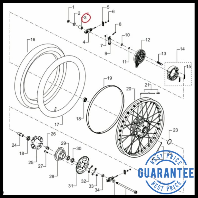 Remove the clip and then remove the nuts. Pull the rear wheel and remove the bearings in an identical process as you did for the front wheel. Replace the bearings and then remount the rear wheel. Figure 11. Diagram of typical rear wheel assembly. Featured Video: How to Remove/Install Rear Wheel Tire