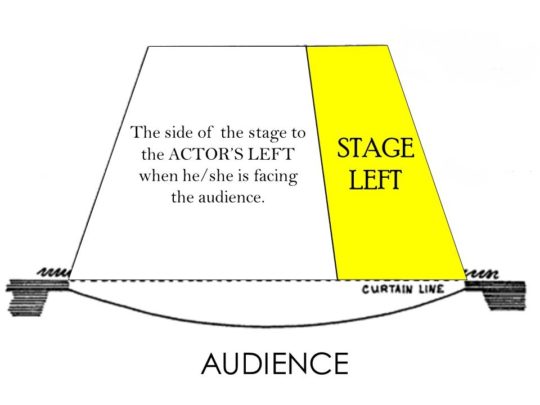 Left and right corresponding to the actor looking out at the audience. See this helpful diagram below: So now when you read the stage directions from Look Back in Anger by John Osborne and read the following in act 1: “(He walks C., behind Cliff, and stands, looking down at his head.)”