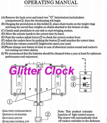 a) 1-day clocks: Pull each chain down slowly to raise the weight. b) 8-day clocks: When pulling the chain down slowly, assist the weight with your hand. **Important: Do not pull the weights down as this can result in severe damage to pulleys. 16) For clocks with manual or automatic night shut-off for strike, cuckoo call and music, please see the