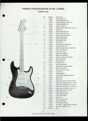 Fender stratocaster parts diagram. FENDER ® SPEAKER MOUNTING. Click here for wiring diagram. NOTE: Will not work with many amplifiers, even those that used LEDs on the original footswitch, without rewiring. Electronics background suggested.... Strat®, Stratocaster®, Esquire®, Telecaster®, Tele®, Jazzmaster®, Jaguar®, Mustang®, P.Bass®, J.Bass® and Fender® are ... The Stratocaster Book by Andre... $14.95. View. Email Me when back in stock. Fender 3 Bolt Micro-Tilt Kit. $20.00. View. Email Me when back in stock. Fender 3 Bolt Micro-Tilt Neck Parts. Original Fender Stratocaster Wiring Diagrams. Complete listing of all original Fender Stratocater guitar wiring diagrams in PDF format. To view or download a diagram, click the "download" link to the right. Fender Stratocaster Model. Part#. Let's list a few components and parts in the Fender Stratocaster that affect tone: Neck and fingerboard. The stratocaster has had maple necks since the very beginning. In 1962 they also offered the option of having a rosewood fretboard on top of the maple neck, a so-called rosewood slab board.