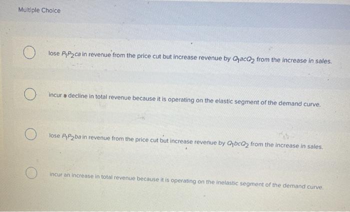 If the firm in the above diagram lowers price from P1 to P2, it will: A) lose P1P 2ba in revenue from the price cut but increase revenue by Q1bcQ2 from the increase in sales. B) lose P1P 2ca in revenue from the price cut but increase revenue by Q1acQ2 from the increase in sales.