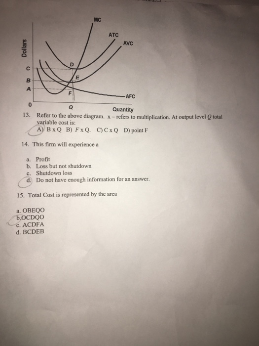 Refer to the above diagram. At output level Q total fixed cost is:. Refer to the above diagram. At output level Q average fixed cost. is measured by both QF and ED. Refer to the above diagram. At output level Q. marginal product is falling. Refer to the above diagram. The vertical distance between ATC and AVC reflects: