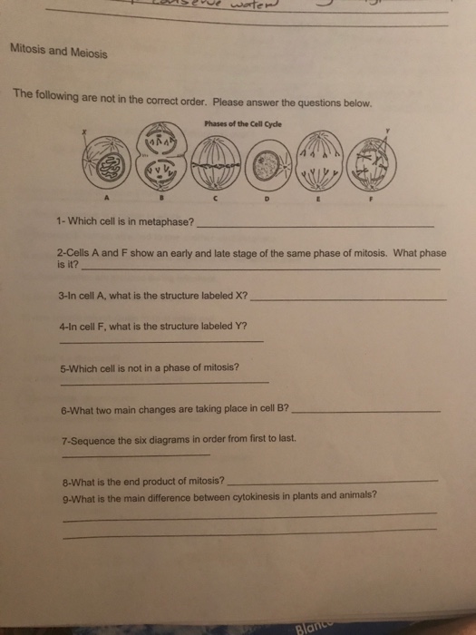 The diagram below shows six cells in various phases of the cell cycle. Note the cells are not arranged in the order in which the cell cycle occurs. Use the diagram to answer questions 1-7. Cells A & F show an early and a late stage of the same phase of the cell cycle. What phase is it? prophase . Which cell is in metaphase? C