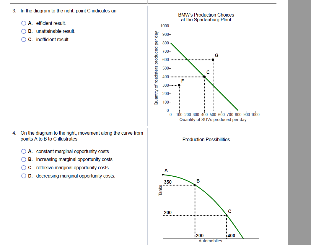 In the diagram to the right, point C indicates an -Efficient result (on the line), inefficient result (under the line), unattainable result (over the line) 3. On the diagram to the right, movement along the curve from points A to B to C illustrates-Increasing marginal opportunity costs (up to down). 4.