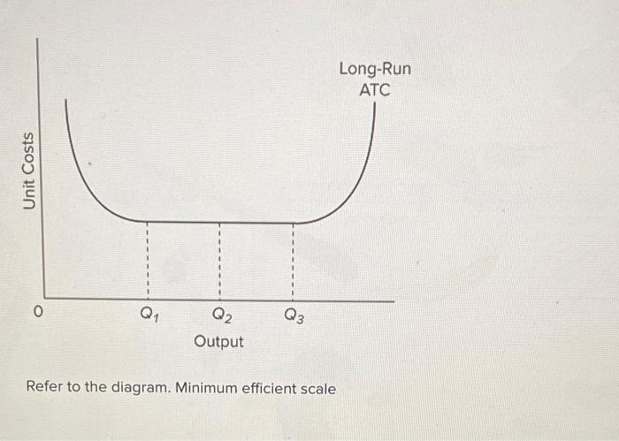Economics. Economics questions and answers. Long-Run ATC Unit Costs 0 Q2 Q3 Output Refer to the diagram. Minimum efficient scale occurs at some output greater than Q3. is achieved at Q1 О O is achieved at Q3 cannot be identified in this diagram. Question: Long-Run ATC Unit Costs 0 Q2 Q3 Output Refer to the diagram.