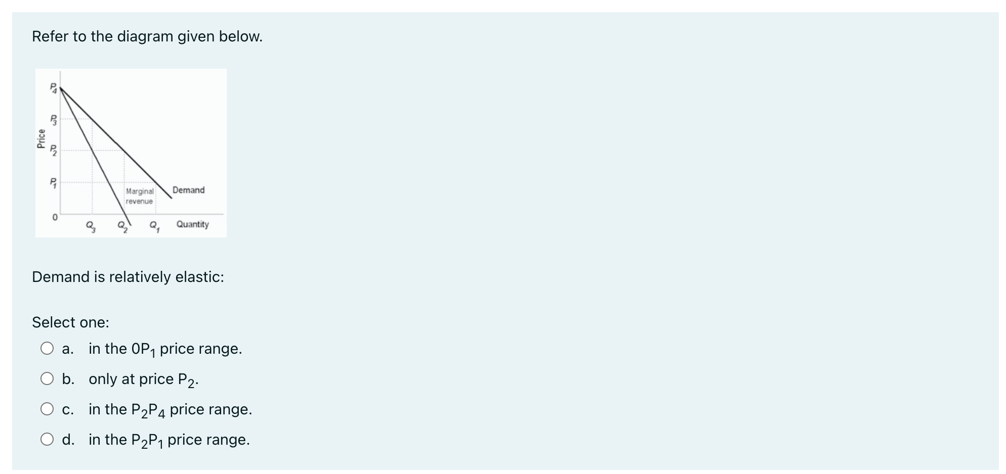 35) Refer to the diagram. In the P1 to P2 price range, we can say: A) nothing concerning price elasticity of demand. B) that consumer purchases are relatively insensitive to price changes. C) that demand is inelastic with respect to price. D) that demand is elastic with respect to price. Refer to the above diagram. In the P1 to P2 price range, we can say: D. that demand is elastic with respect to price. Rating: 5 · 1 review