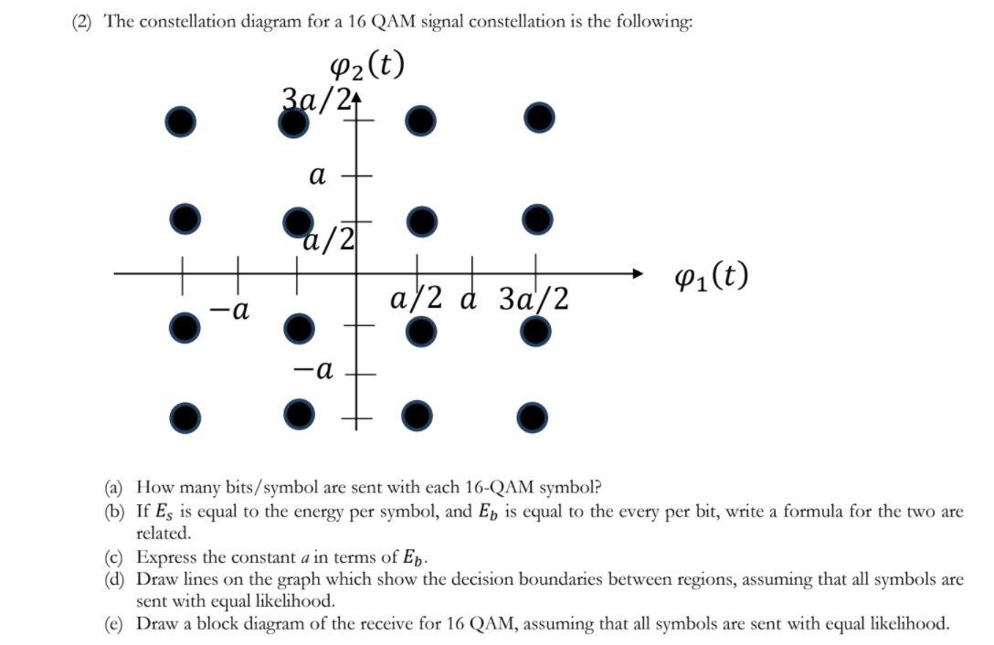 Transcribed image text: (2) The constellation diagram for a 16 QAM signal constellation is the following: 42(t) 3a/24 a a/2 a/2 di (t) -a 3a/2 -a (a) How many bits/symbol are sent with each 16-QAM symbol? (b) If Es is equal to the energy per symbol, and Ep is equal to the every per bit, write a formula for the two are related.