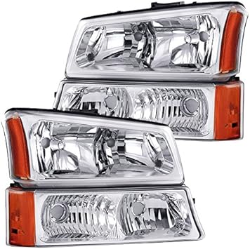 [4-piece set] chrome bezel headlight + front parking turn signal light bumper lamp housing assembly replacement for 2003-2006 chevy avalanche ...
