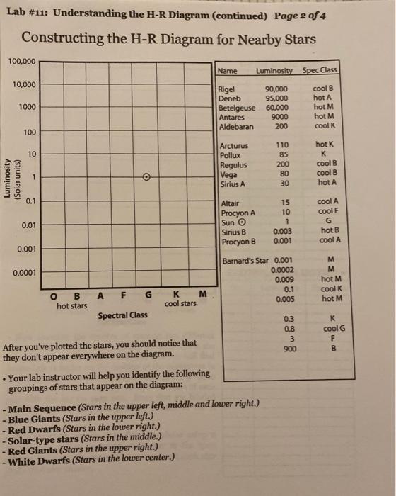 Hr diagram lab answers. Lab: H-R Diagram. Purpose: In this lab we will investigate the relationship between the temperature, brightness and diameter of stars. Introduction. The H-R Diagram is a tool that astronomers use to classify stars based on their luminosity, magnitude, temperature, spectral class and evolutionary stage. Lab # 11: Understanding the H-R Diagram & Stellar Evolution: Purpose: To learn how astronomers classify stars using luminosity & temperature. To construct a H-R Diagram to help understand stellar evolution. Method: Luminosity = Brightness x Distance. Temperature is a measure of heat energy. Select H-R diagram. Introduction: In the early 1900s, two astronomers—Ejnar Hertzsprung and Henry Norris Russell—independently made a graph comparing star luminosity and temperature. This graph, now known as a Hertzsprung-Russell diagram, or H-R diagram, is still used today to classify stars into groups. The purpose of this lab is to have you identify the main characteristics used to classify stars, and the five main types of stars. You will also become familiar with the use of the Hertzsprung-Russell (HR) diagram used for the classification of stars.