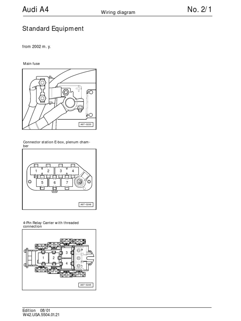 Audi A4 Electrical Wiring Diagram electrical schematics connectors harness and pinouts Download. Audi A4 (8D,8D2,8D5) 1995-2002 Workshop Manuals + Wiring Diagrams. Audi A4 (8E,8E2,8E5,8EC,8ED) 2001-2007 Workshop Manuals + Wiring. Audi …