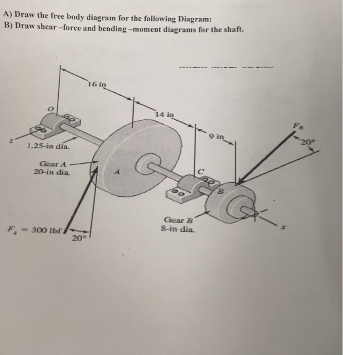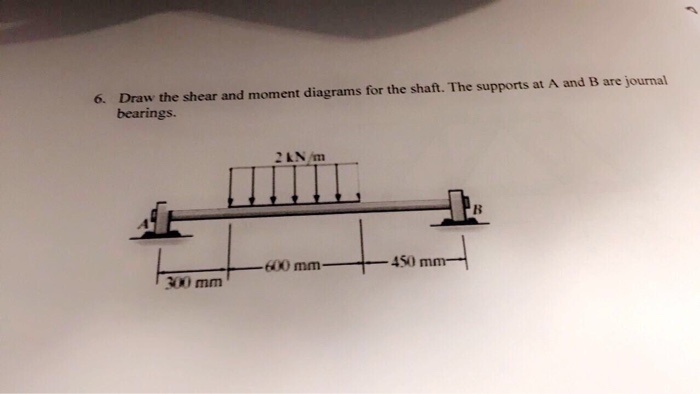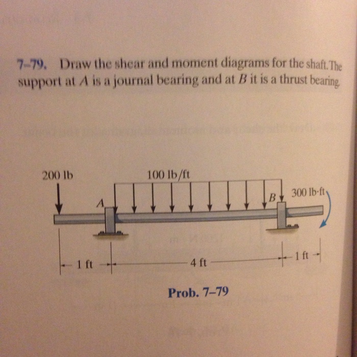Shear diagrams always begin and end at zero, with all of the forces on the member shown in between.Starting from the left, the first force you come across is the 10 lb downward force at the left end. This is the first point of data, draw a line from zero to negative 10.. Continuing on the next force is 21.67 lb upward at the A support. Answer to Draw the shear diagram for the shaft. The support at A is a journal bearing and at B it is a thrust 200 1b 100 lb/ft B 300 lb.ft bearing. 1 ft 4.1 answer · Top answer: Explanation is shown below. Image transcriptions Free Body Diagram : 20 016 100 lb /ft 300 16- f+ A B RA RB Ift 4 ft Ift Reactions : EMAT + = 0i Rex 4 ... Jan 28, 2021 — 1 Answer to Draw the shear and moment diagrams for the shaft. The support at A is a journal bearing and at B it is a thrust bearing.1 answer · Top answer: Page 200 lb • | 100 lbise zoolb-fie d I 2 ? ? A I ft aft Zoolb B R Ball aft agt ago tay tay • f 600 Take moment (A) 11 400x2 + 300 goo foy (+) +200x1 ... A) Draw the shear diagram for the shaft. The support at A is a journal bearing and at B it is a thrust bearing. B) Draw the moment diagram for the shaft. The support at A is a journal bearing and at B it is a thrust bearing.