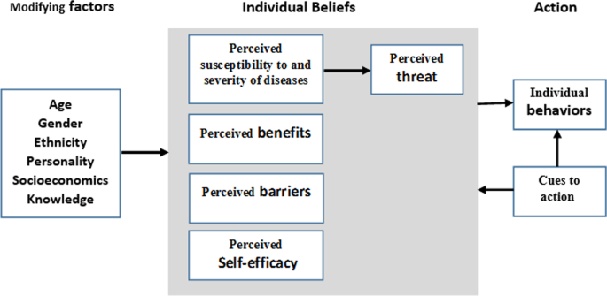 Health Belief Model. Becker's "Health Belief Model" will used to provide the theoretical underpinning for the study. The model is a framework for explaining people's behaviour aligned to health, physical and mental well-being (Polit & Beck, 2012). The model suggests that a person's health have to connect to behaviour based on two factors. The Health Belief Model (HBM) posits that messages will achieve optimal behavior change if they successfully target perceived barriers, benefits, self-efficacy, and threat. While the model seems to be an ideal explanatory framework for communication research, theoretical limitations have limited its use in the field. HEALTH BELIEF MODEL 55. hospital interv ention combined with a f ollow-up telephone call; and (4) a follow-up telephone call. without the hospital intervention. Only 33% of the control group ... The health belief model stipulates that a person's health-related behavior depends on the person's per-ception of four critical areas: the severity of a poten-tial illness, the person's susceptibility to that illness, the benefits of taking a preventive action, and the barriers to taking that action (Hochbaum 1958; Rosenstock 1960, 1966 ...