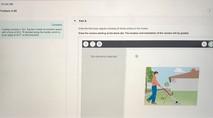 (a) Draw the free-body diagram showing all forces acting . Physics. A woman pushes a lawn mower with a con- stant force of 112 Newtons at an angle of 37degrees with respect to the horizontal. The lawn mower moves at a speed of 20 cm/sec. What is her power output? (1 hp = 746 Watts) physics. 1. a) Draw the free-body diagram showing all forces acting on the mower. b) Calculate the horizontal friction force on the mower. c) Calculate the normal force ... Part A Draw the free body diagram showing all forces acting on the mower. Draw the vectors starting at the black dot. The location and orientation of the ... Transcribed image text: 4.50 Draw the free-body diagram showing all forces acting on the mower Calculate the horizontal fricton force on mower.