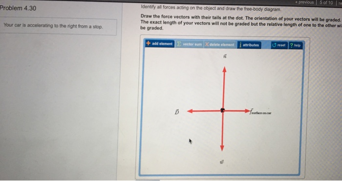 (Get Answer) - Your car is accelerating to the right from ... Your car is accelerating to the right from a stop. Identify all forces acting on the object and draw the free-body diagram. Draw the force vectors with the tails at the dot. Orientation of vectors are important, but the exact length of the vectors are not important. Just the relative length from one to the other is important. study.com › learn › free-body-diagram-questions-andFree Body Diagram Questions and Answers | Study.com Draw the free-body diagram of the beam which supports the 80-kg load and is supported by the pin at A and a cable which wraps around the pulley at D. Explain the significance of each force on the d... An Easy Guide to Understand Free Body Diagrams in Physics ... Draw the free body diagram by representing the various forces acting on the sack, as well as the pulley. External forces are also acting, in this case. Answer : In order to draw these diagrams flawlessly, one must have good knowledge of physics and mathematics, at least on a basic level. Solved HI Review | Constants Periodic Table Your car is ... Draw a free-body diagram of the car. Suppose that the car is moving to the right Draw the vectors starting at the black dots. The location and orientation of the vectors will be graded. The length of the vectors will not be graded. m Vectors: w Weight ed ÄŽ Air resistance f.