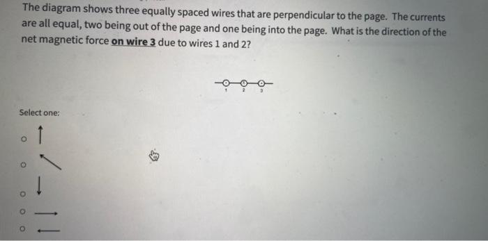 Solved The diagram shows three equally spaced wires that are ... The diagram shows three equally spaced wires that are perpendicular to the page. The currents are all equal, two being out of the page and one being into the page. Rank the wires according to the magnitudes of the magnetic forces on them, from least to greatest -- 1 2 3 0 1 and 3 tie, then 2. O 3, 2, 1. O 2, 1 and 3 tie.