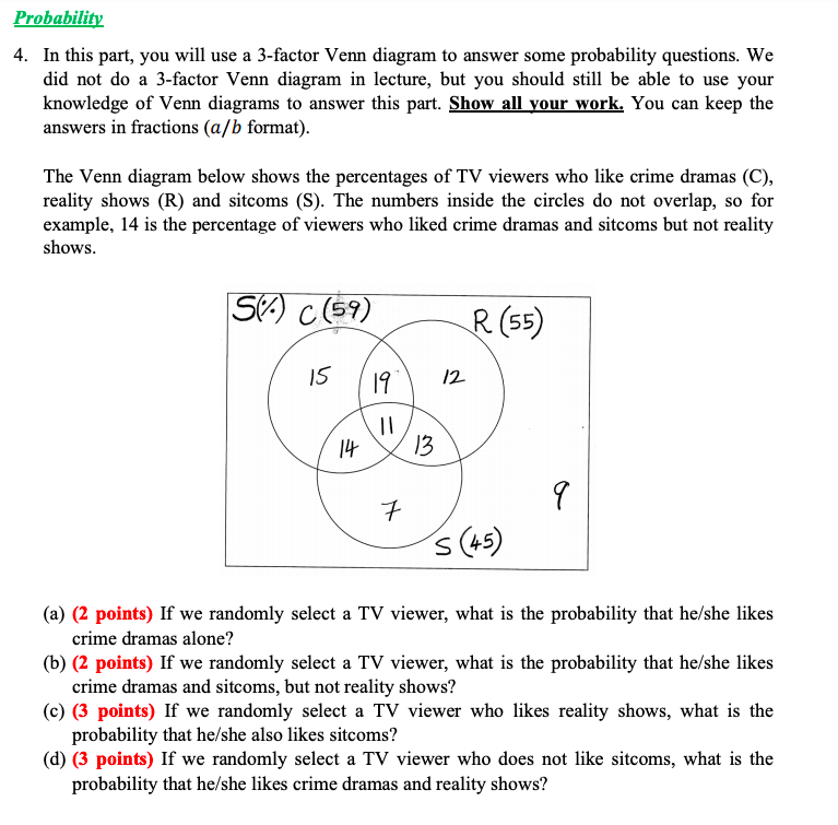 combinatorics - Calculating a 3 Circle Venn Diagram only ... Calculating a 3 Circle Venn Diagram only knowing A, B, and C? Ask Question Asked 13 days ago. Active 12 days ago. Viewed 128 times ... I guess I went on the wrong direction "from the very beginning" because it was so similar to Venn Diagram problems and got mislead by it! Thank you very much for your help! $\endgroup$ - Noob002.