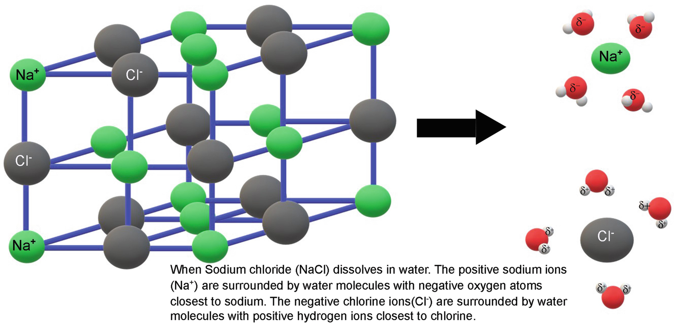 Dissolution of NaCl in Water - interactive simulations - eduMedia Sodium chloride (NaCl) is in fact the joining of an Na+ ion and a Cl- ion, which mutually attract one another via electrostatic attraction. This process continues until the salt is totally dissolved. Learning goals. To illustrate the different stages in the dissolution of salt (sodium chloride) in water.
