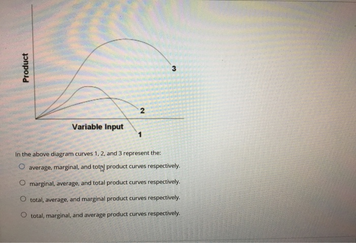 Solved Output In the diagram, curves 1, 2, and 3 represent ... Output In the diagram, curves 1, 2, and 3 represent: total variable cost, total fixed cost, and total cost respectively. average variable cost, marginal cost, and average fixed cost respectively. O marginal product, average variable cost, and average total cost respectively. total fixed cost, total variable cost, and total cost respectively.