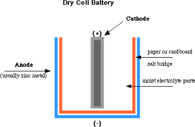 8.3: Electrochemistry- Cells and Batteries - LibreTexts The dry cell is a zinc-carbon battery. The zinc can serves as both a container and the negative electrode. The positive electrode is a rod made of carbon that is surrounded by a paste of manganese(IV) oxide, zinc chloride, ammonium chloride, carbon powder, and a small amount of water. ... Figure \(\PageIndex{3}\): The diagram shows a cross ...