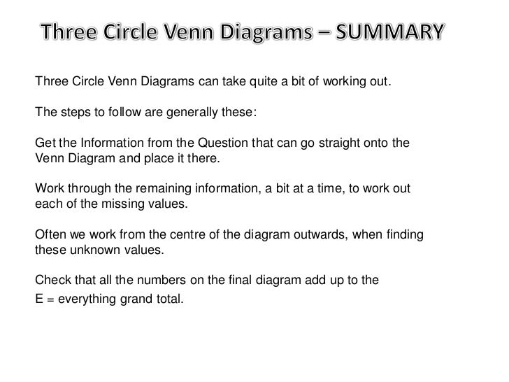 Intersection Of Three Sets (video lessons, examples and ... Venn Diagram Problem With 3 Circles Use the given information to fill in the number of elements in each region of the Venn Diagram. This video solves two problems using Venn Diagrams. One with two sets and one with three sets. Example 1: 150 college freshmen were interviewed. 85 were registered for a math class