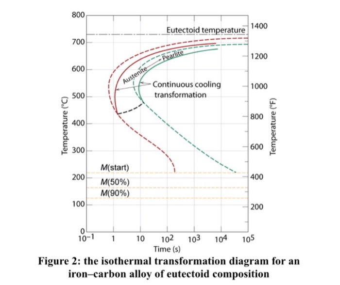 SOLVED:Using the isothermal transformation diagram for an iron-carbon ... Using the isothermal transformation diagram for an iron-carbon alloy of eutectoid composition (Figure 10.22 ), specify the nature of the final microstructure (in terms of microconstituents present and approximate percentages of each) of a small specimen that has been subjected to the following time-temperature treatments.