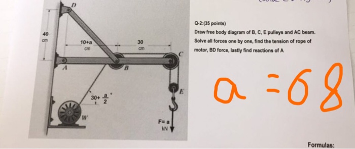 Free Body Diagram -Study Material for IIT JEE | askIITians Now separate them from others by cutting the string contacts (sort of imaginary separation) In effect, make them free (that's where comes the name free body) from other components and at the same time show all the forces acting on it, external as well as internal, arising due to separation from other parts. Free Body Diagram of CablePulley System C The - SlideToDoc.com Free Body Diagram of Cable-Pulley System C The system is held in equilibrium at angle Θ by the tension, T. 30º *Click to see solutions A cable connects pulley A to the ceiling at point C. A Θ T Ignore the weight of the pulley and the cable. B FBD of pulley A TAC y x 30º A TAC= The tension FROM the supporting cable (at 30º) ON the pulley.