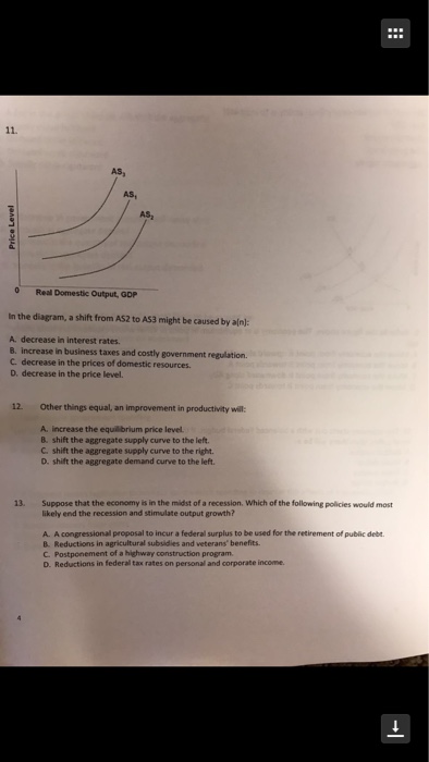 Solved AS3 AS, AS2 Price Level 0 Real Domestic Output, GDP View the full answer Transcribed image text: AS3 AS, AS2 Price Level 0 Real Domestic Output, GDP In the diagram, a shift from AS2 to AS3 might be caused by a (n) A) decrease in the … In the above diagram.docx - In the above diagram, a shift from AS3 … View In the above diagram.docx from MBA 12345 at Apeejay Institute of Technology. In the above diagram, a shift from AS3 to AS2 might be caused by an increase in: A) business taxes and government Solved In the diagram, a shift from AS3 to AS2 might be - Chegg See the answer In the diagram, a shift from AS3 to AS2 might be caused by an increase in: A.) Business taxes and government regulation B.) The prices of imported resources C.) The prices of domestic resources D.) productivity Expert Answer 100% (12 ratings) D.) … View the full answer Previous question Next question