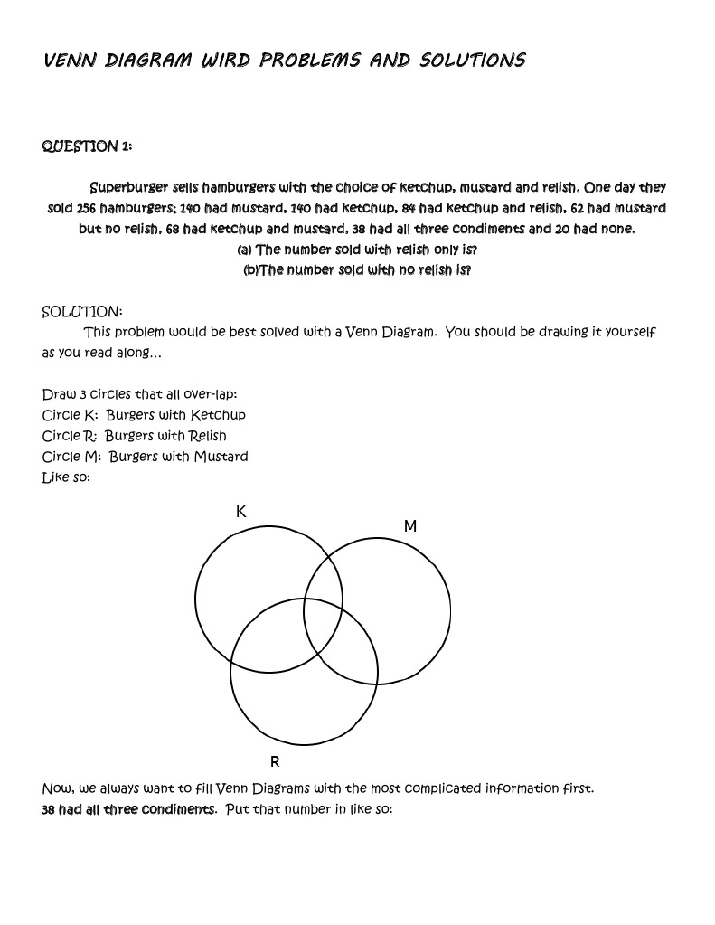 Venn Diagram Word Problems with 3 Circles - onlinemath4all We can use Venn diagram with 3 circles to represent the above information as shown below. Let us do the following changes in the Venn diagram. We can get the following results from the Venn diagram shown above. Number of elements related only to A is = a - (w + y - z) Number of elements related only to B is = b - (w + x - z)