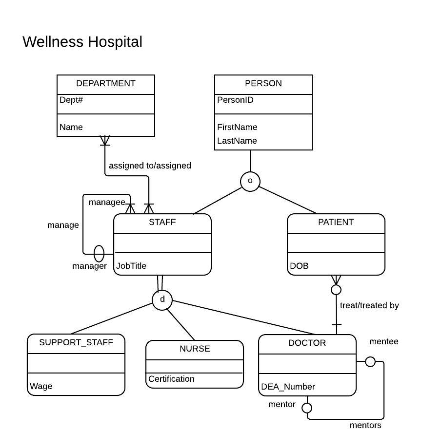 Er diagram of hospital. ER diagram for a hospital management system (Crow's Foot notation) An entity-relationship diagram can also be used in the opposite direction, to document and analyze an existing system. ER diagrams are even easy for non-technical colleagues to understand, so they can be shared for feedback and to define requirements. ... Before drawing an ER diagram for our hospital management system, we should spend some time ... Hospital management system - Entity-relationship diagram example - Gleek This ER diagram represents a hospital management system. A patient can schedule one or many appointments when a doctor can have none or many appointments available. ... We often make an entity-relationship (ER) diagram, ERD, or entity-relationship model, in the early stages of designing a database. An ERD is perfect for quickly sketching out ... Hospital ER-Diagram | Entity Relationship Diagram for Hospital ... #er-diagram #hospitalERDIn this video we will discuss the ER-Diagram for Hospital Management System.Entities of Hospital Management SystemAttributes and Rela... ER Diagrams for Hospital Management System - Edrawsoft To better understand an ER diagram, we will discuss a few examples about ER diagram for hospital management systems. Yon can download EdrawMax and click the template you want, use it Free. Example 1 - Dental Clinic ER Diagram Following is an example of an ER diagram of a dental clinic. The diagram shows the clinic's database and its related ...