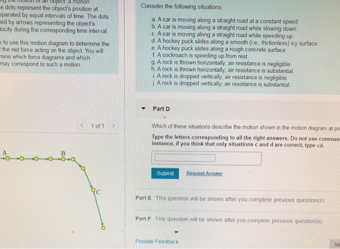 Part E Which of these diagrams may possibly correspond to the situation ... A rock is dropped vertically ; air resistance is substantial . J. Part H Which of these situations describe the motion shown in the motion diagram at point A? Type the letters corresponding to all the right answers in alphabetical order. Do not use commas. For instance, if you think that only situations C and D are correct, type CD. ANSWER: AD