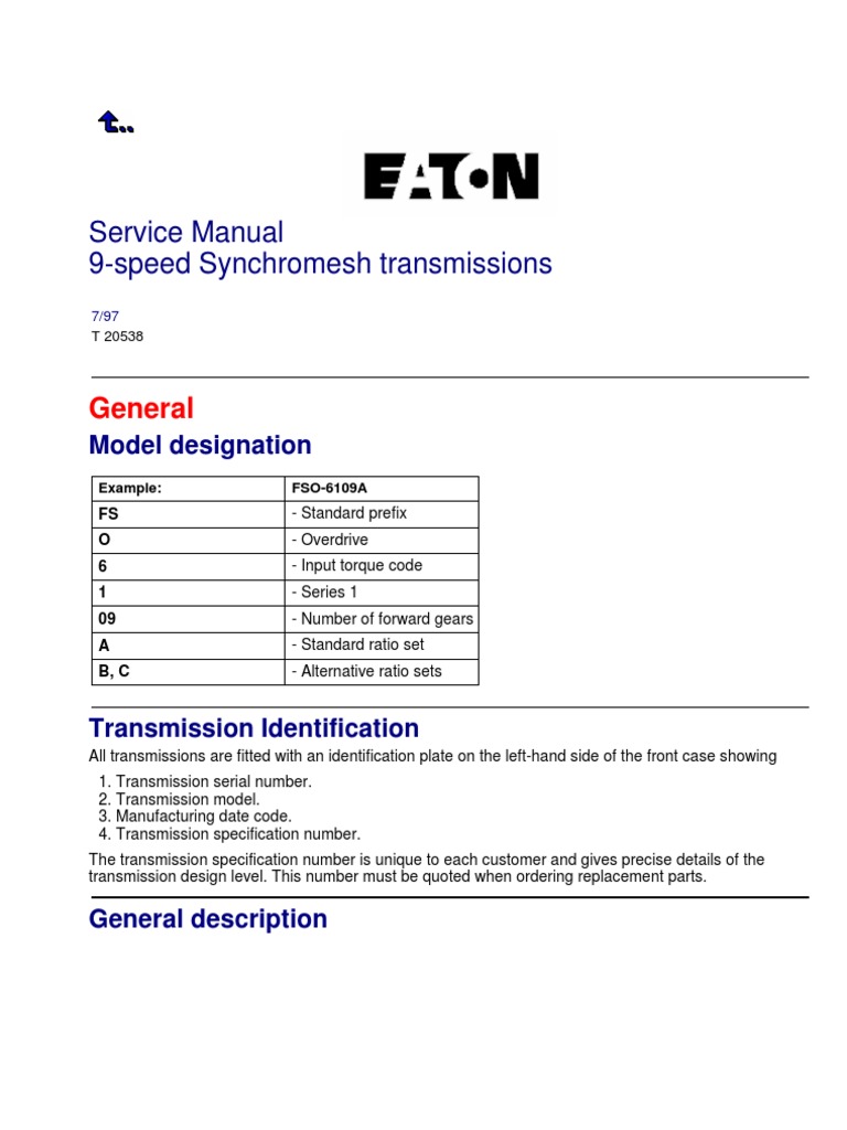 Eaton fuller 9 speed transmission diagram. eaton fuller 10 speed transmission diagram Genuine fuller reman 18 ... We have 9 Images about Wiring Diagram: 10 13 Speed Eaton Fuller Transmission Diagram like Genuine Fuller Reman 18 Speed Transmissions | e Pro Gear, Wiring Diagram: 10 13 Speed Eaton Fuller Transmission Diagram and also 10 speed overdrive shift pattern diagram. Eaton fuller transmission P/N. Here you go: Wiring Diagram: 10 13 Speed Eaton Fuller ... Eaton Fuller transmission parts. Fuller transmissions and replacement ... Eaton Fuller transmission parts for 5, 6, 7, 8, 9, 10, 13, 15, and 18 speed transmissions. All Eaton Fuller transmission models and parts in stock ready to ship today. Eaton 9 Speed | PDF | Manual Transmission | Transmission (Mechanics) The Eaton 9-speed transmissions have nine forward speeds and are part of a medium duty range of synchromesh transmissions. They have a simple shift pattern using a unique single rail selector mechanism. Direct drive or overdrive top gear versions are available. Eaton Fuller Transmission Troubleshooting & Diagnostic Guide Guide to servicing and repairing Eaton Fuller heavy-duty truck transmission, assistance locating the issue of transmission trouble, analyze the cause and make necessary repairs for 7, 8, 9, 10, 13, 15 and 18 speed Eaton transmissions. For more in-depth assistance refer to your transmission model service manual or give us a call at 877-776-4600.