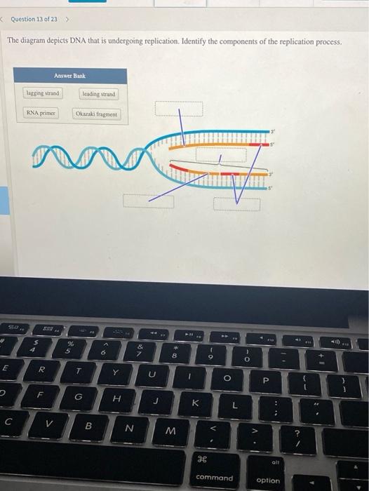 the diagram depicts dna that is undergoing replication identify the components of the replication process_ answer bank lagging strand rna primer okazaki fragment leading strand 89691
