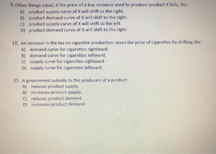 Microeconomics Chapter 3 - Flashcards | StudyHippo.com 125. Refer to the above diagram, which shows demand and supply conditions in the competitive market for product X. Other things equal, a shift of the supply curve from S0 to S1 might be caused by a(n): A. increase in the wage rates paid to laborers employed in the production of X. B. government subsidy per unit of output paid to firms producing X. C. decline in the price of the basic raw ...