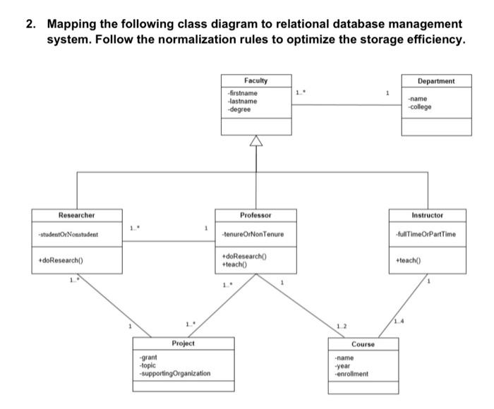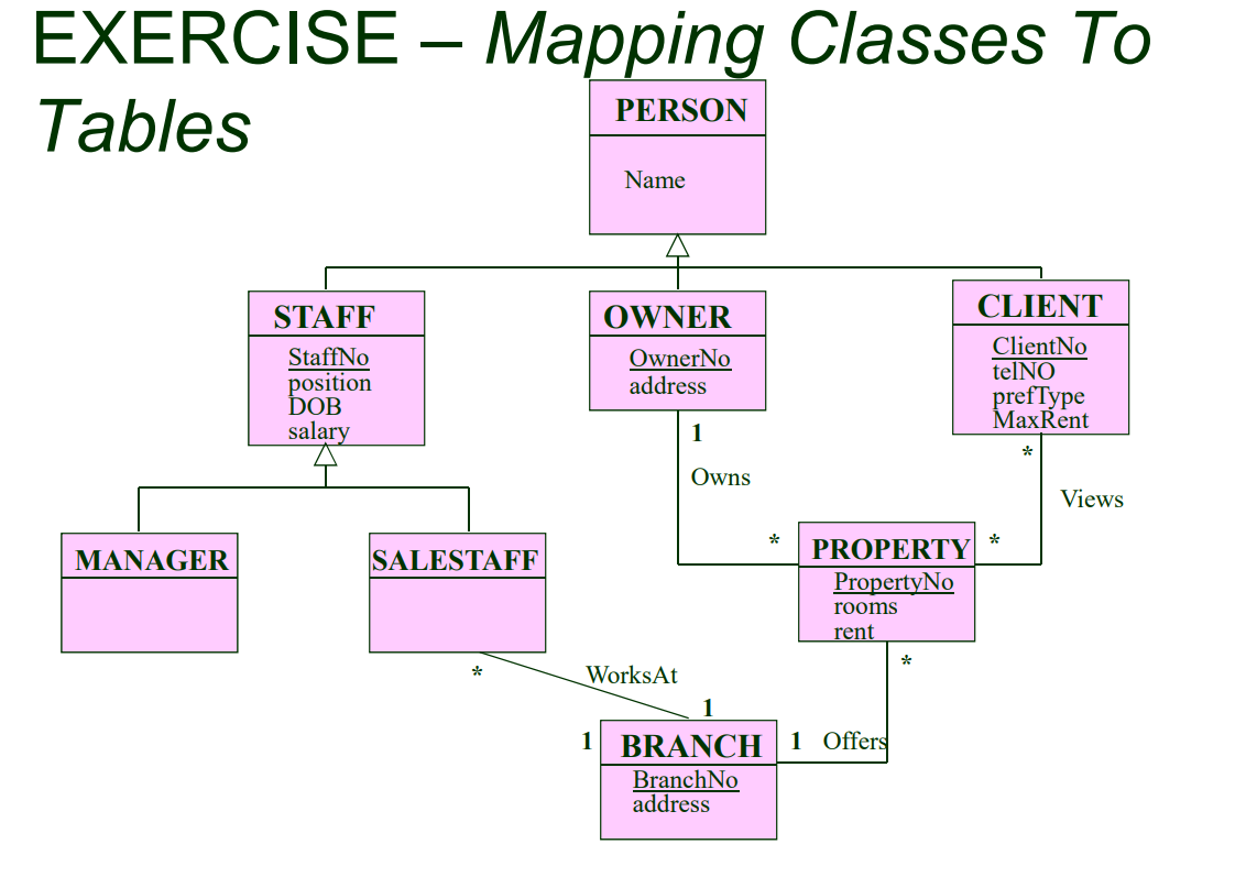 Ch. 9 Flashcards | Quizlet True Each class on an class diagram is represented by a (n) ____ in a relational database. table In a one-to-many association the primary key of the "many" class is placed as a foreign key in the "one" class. False How are classes and relationships on a class diagram represented Answer to How are classes and relationships on a class diagram represented in a relational database? | SolutionInn. Toggle navigation Menu . Books FREE; Tutors; Study Help . Latest Questions. Business; Computer Science; ... Database Design; C++.NET; Object-Oriented Programming\ Computer Systems; Data Structures And Algorithms; Systems And ... Database Design - Classes & schemes - California State University, Long ... Each class is uniquely defined by its set of attributes (UML and ER), also called properties in some OO languages. Each attribute is one piece of information that characterizes each member of this class in the database. Together, they provide the structure for our objects (entities in ER) or database tables. MIS Chapter 9 Flashcards | Quizlet A foreign key is a field or set of fields stored in one table that also exists as a primary key in another table. True Classes that participate in a classification hierarchy can be represented within a relational database as a set of tables with the primary key of the general class table replicated in the other tables. True
