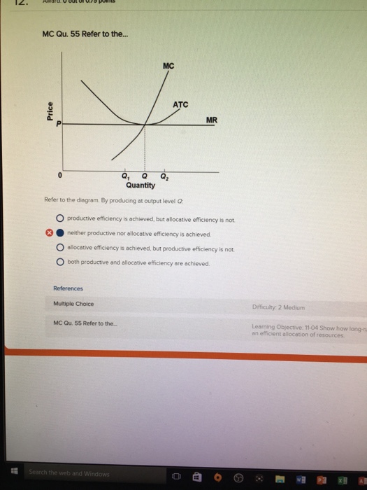 Refer to the diagram. by producing at output level q:. Refer to the above diagram At output level Q 1 A neither productive nor AACSB: Reflective ThinkingBloom's: Level 3 ApplyDifficulty: 2 MediumLearning Objective: 09-05 Show how long-run equilibrium in pure competition produces an ... Answers to Homework #4 What is the variable cost of producing this level of output? ... From the graph we can see that when Q is equal to 10 units, ATC = $9 per unit and AVC = $2 ... Chapter 11 ND 12 Flashcards - Quizlet Refer to the above diagram. By producing output level Q: both productive and allocative efficiency are achieved. ECON Module 8 Flashcards | Chegg.com If this competitive firm produces output Q, it will: earn a normal profit. Refer to the above diagram. At output level ...
