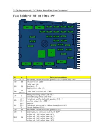 Fuse box diagram Toyota - Fuse box diagram Fuse box in engine compartment. fuse box location. fuse box diagram. Fuse box 1 - type 1. legend. 1 Starter motor relay 2 Engine coolant blower motor relay 2 3 Engine coolant blower motor relay 1 4 Clutch control actuator relay- if fitted … Read more Fuses and relay Toyota Avensis 1997-2003 by viomar
