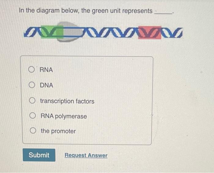 Mastering Biology: Biotech and Gene Expression - Quizlet In the diagram below, the gray unit represents _____. RNA polymerase: RNA polymerase untwists a portion of the DNA double helix. In the diagram below, the green unit represents _____. the promoter: The promoter is the region of DNA at which the process of transcription begins. In the diagram below, the two blue strands represent _____. BIOL 1406 CH#17.2.docx - In the diagram below, the gray unit represents ... View BIOL 1406 CH#17.2.docx from PSYC 2314 at Brookhaven College. In the diagram below, the gray unit represents _. RNA DNA transcription factors RNA polymerase the promoter Submit Previous