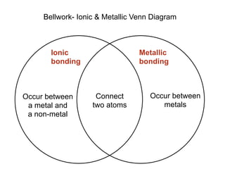 Lecture 8.1- Ionic vs. Covalent - SlideShare Bellwork- Ionic & Metallic Venn Diagram Ionic Metallic bonding bonding Occur between Connect Occur between a metal and two atoms metals a non-metal 2. Noble gases don't bond! In nature, matter takes many forms. The noble gases, including helium and neon, are monatomic (means they exist as single atoms). ... 3. ionic vs. covalent Ionic ...